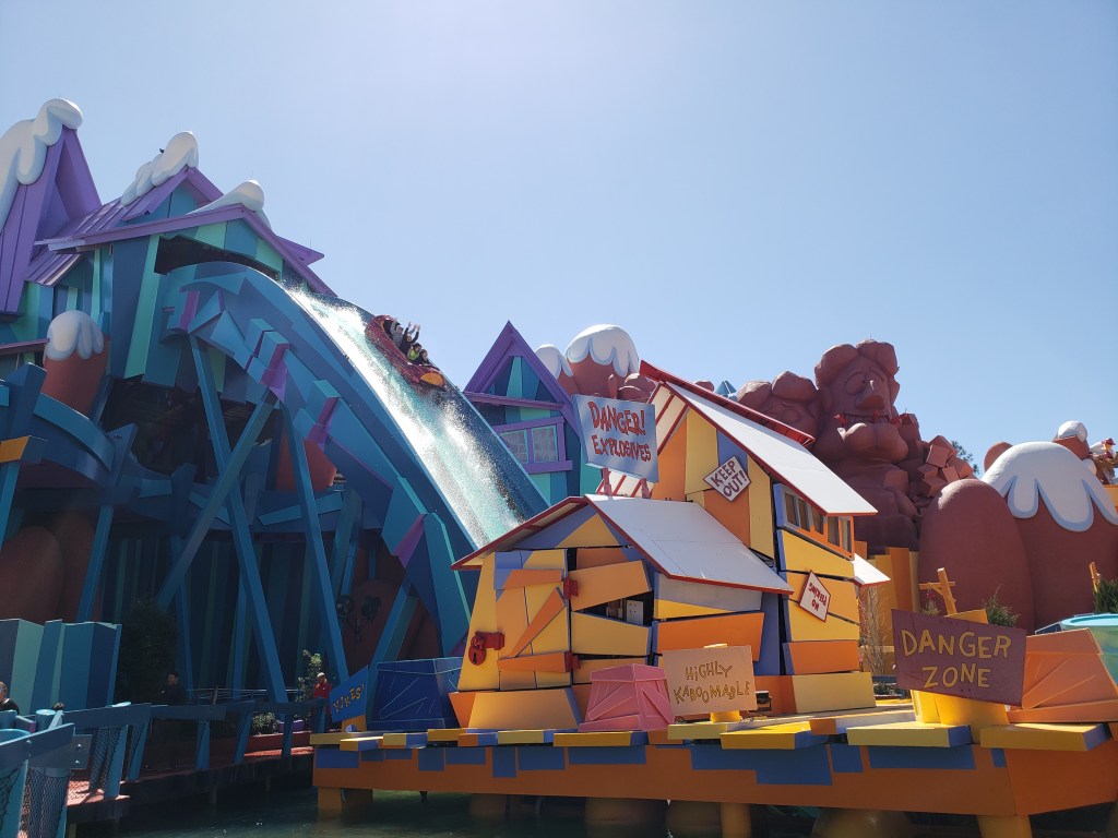 After the Hulk coaster, it was still pretty chilly, so the wait times for the water rides were really short! I heard about a log flume ride called Dudley Do-Right’s Ripsaw Falls through a YouTube video and I heard it was very similar to Splash Mountain. Since I won’t be getting my free park admission pass for a few weeks (or sooner), I thought that the Ripsaw Falls ride would be the perfect substitute. It indeed was the perfect substitute because it had an outdoors vibe with woodland creatures, small drops where riders get a little wet, and a big drop at the end where riders get soaking wet! My dad didn’t go on that one, but my mom and I enjoyed it.