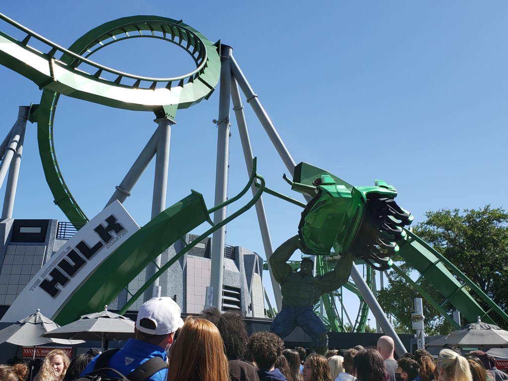 On Sunday, March 13, the day before I started my Disney College Program, my parents and I went to Universal’s Islands of Adventure. Because we left Disney’s Hollywood Studios during the park’s closing time, my parents and I slept in for a bit and we didn’t get to Islands of Adventure till 11:00 a.m. We started off the day by riding The Incredible Hulk Coaster. It was closed earlier due to the windy weather, but it opened back up when we just got to the park, so the wait time was short. However, word got out that the coaster was open again, so the wait time jumped from 20 minutes to 95 minutes in such a short time. It was worth it though, because that Hulk coaster was awesome! The loops and turns weren’t as intense as the Hollywood Rip Ride Rockit roller coaster, which my mom appreciated greatly.