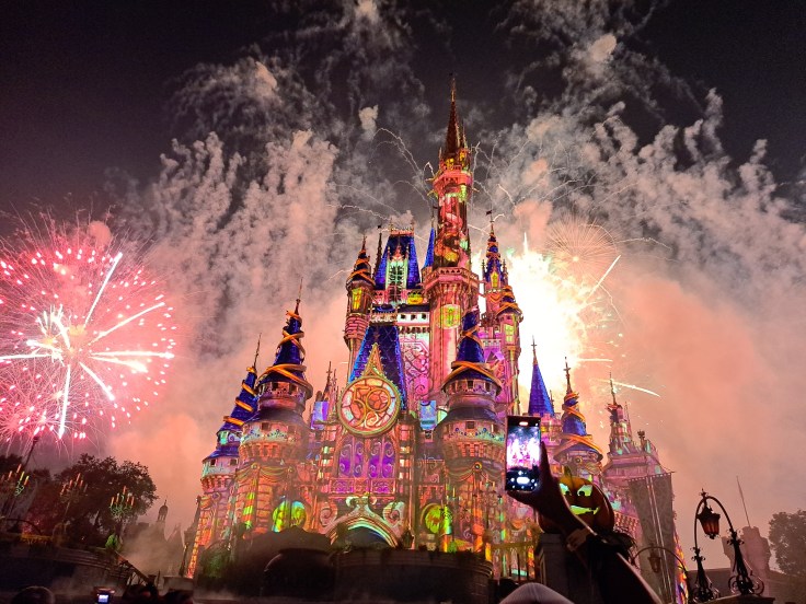 The craziness really began when I left Tomorrowland and headed to Main Street, U.S.A./Cinderella’s Castle to watch back-to-back entertainment. I found a good spot in front of the castle (despite a guy in front of me that was filming on his phone) to watch the ‘Disney’s Not-So-Spooky Spectacular’ fireworks show at 10:15 p.m. The projections on the castle were incredible and Jack Skellington was there; holy cow! Plus, I enjoyed the story of Mickey and the gang trying to escape a haunted house.