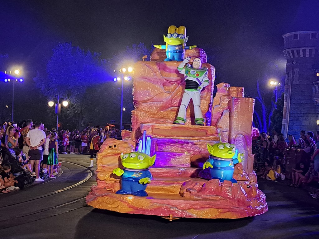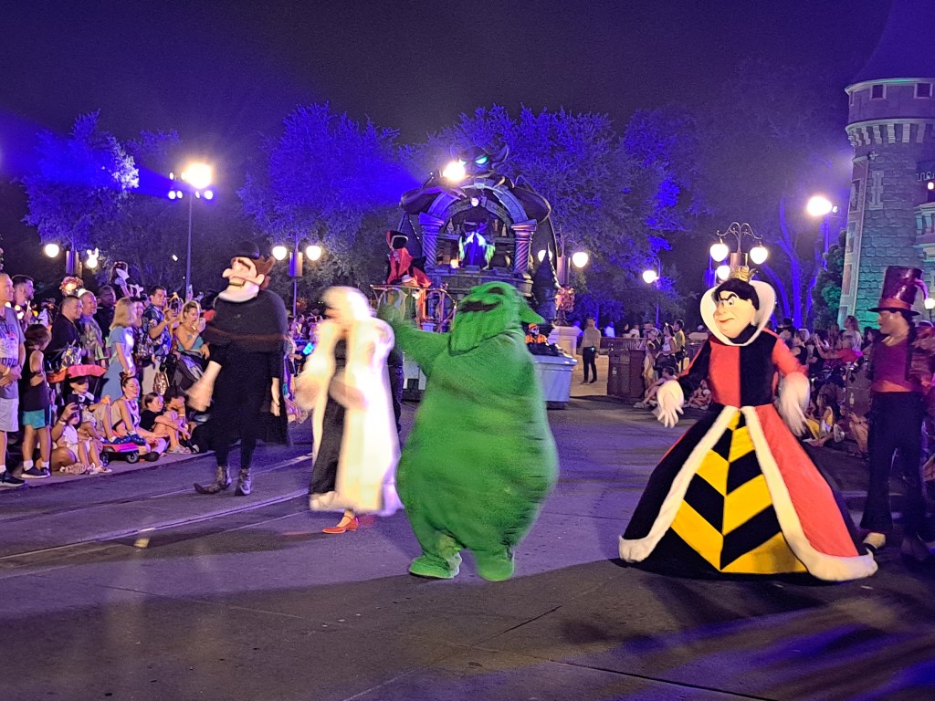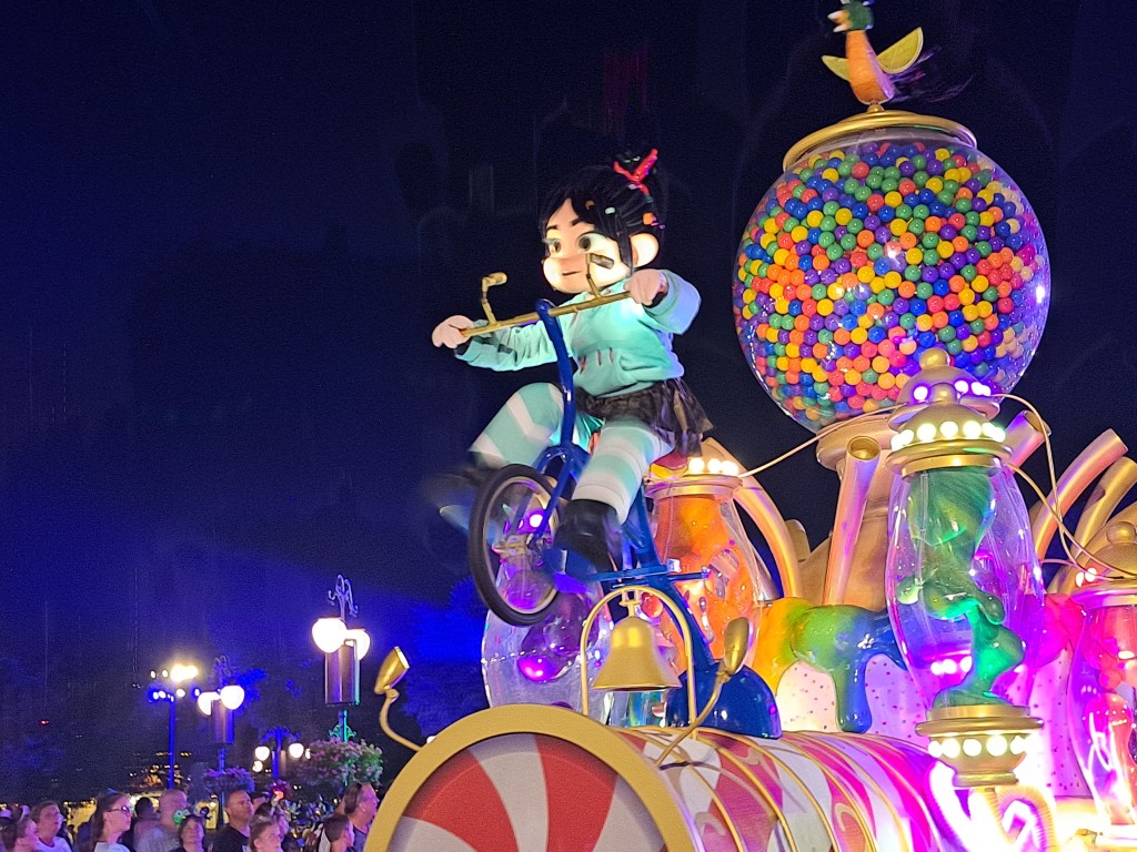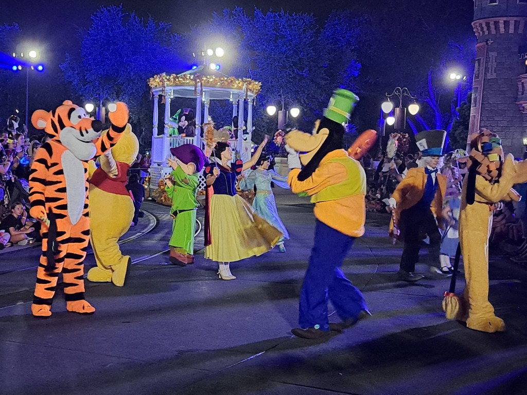 Finally, it was time for ‘Mickey’s Boo-To-You Halloween Parade.’ I’ve heard amazing things about that parade, so I was pumped! This was the second showtime for the parade and I think it was supposed to take place at 11:15 p.m., but it took place at around 11:30 p.m. instead. I heard that Max Goof dressed as Powerline sometimes appears before the parade, but I never saw him from where I was standing, unfortunately. ‘Mickey’s Boo-To-You Halloween Parade’ was really cool, though. I got to see so many rare characters that I never get to see like Bowler Hat Guy from Meet the Robinsons (2007), the hyenas from The Lion King (1994), Ralph and Vanellope from Wreck-It Ralph (2012), and the hitchhiking ghosts from ‘The Haunted Mansion’ ride. I’ll admit that the song used in the parade annoyed me very quickly, but that’s just a minor complaint.
