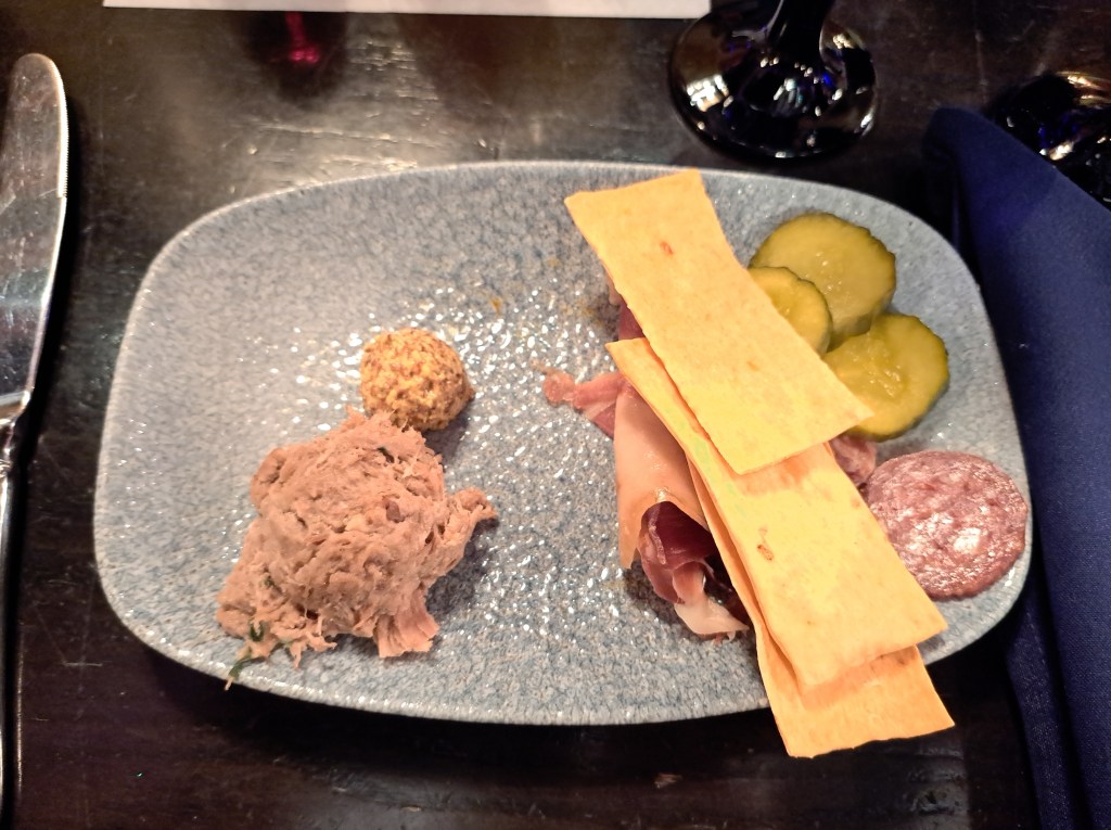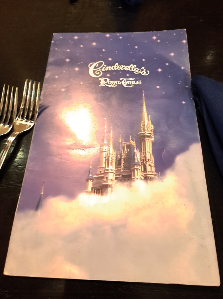 The theming of Cinderella’s Royal Table was incredible. Everything from the castle, the stained glass windows, the flags above us, the ceilings, the menu, the cast members’ costumes, the utensils, the bell sounds, and the food was amazing. I don’t know if Cinderella’s Royal Table is the fanciest restaurant I’ve ever dined at, but it’s one of those places, for sure! I got apple juice as a drink, Charcuterie as my appetizer, the ‘When Will My Life Begin Chicken and Pasta’ as an entrée, and ‘The Clock Strikes Twelve’ for dessert.