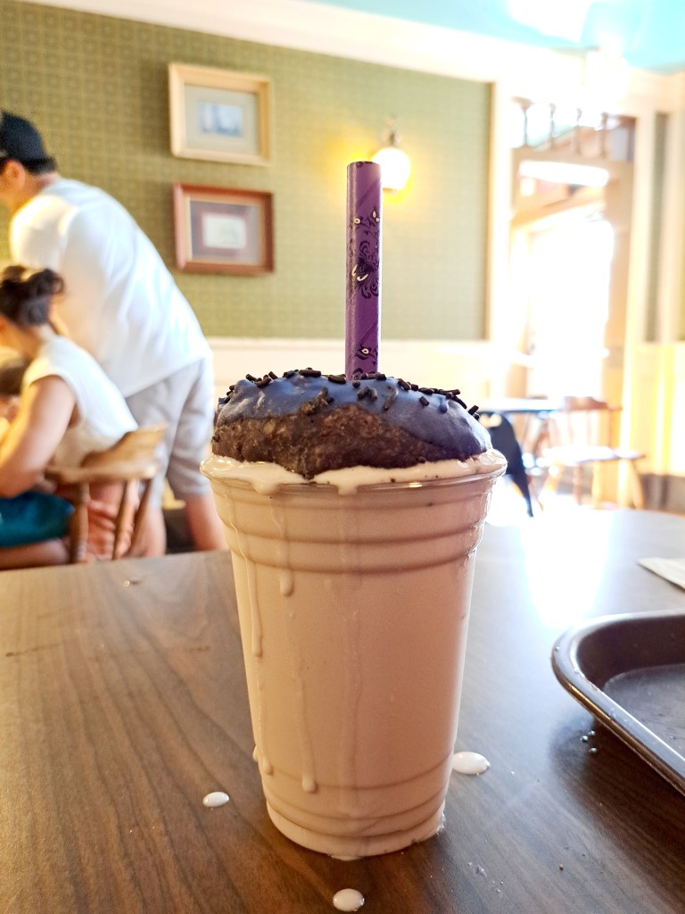 Then, I met up with my friend and her mom at the Columbia Harbour House to get a snack. I got the Happy Haunts Milk Shake. According to the menu, it was a blackberry milkshake with a purple chocolate-glazed donut covered with black sprinkles. It was yummy, but it was also very messy because the milkshake melted fast. I struggled to get a good picture of it, but I tried my best!