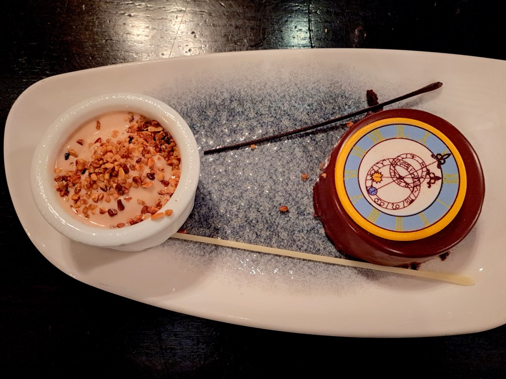 The Charcuterie had cured meats, pickles, crackers, and spreadings (not sure if that’s the right word for it) to put on the crackers. The ‘When Will My Life Begin’ pasta was served in a frying pan and was basically yellow pasta with braised chicken, pesto sauce, and flower and moss decorations. ‘The Clock Strikes Twelve’ was a chocolate mousse with a caramel filling and hazelnut gelato on the side. Everything was so good and I was pleasantly surprised with how filling the meals were. I saw pictures of the ‘When Will My Life Begin’ pasta online and I thought the portion size was too small, but with the appetizer and dessert, I was full!