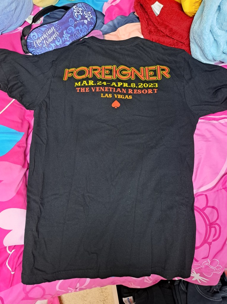 We were staying at the California Hotel & Casino, but the concert was at The Venetian Hotel. So we left the California hotel at about 5:52 p.m., took an uber to the Venetian and arrived at around 6:15 p.m. We killed some time by walking around the casino and talking to a nice guy that goes to a lot of concerts in his free time. My dad also bought me a shirt to remember the Foreigner concert by; it had a jukebox on the front with the band logo and the back showed the length of the Vegas residency. It was a decent shirt; it wasn’t worth the $45 that my dad spent, but it was decent. I wanted to buy my dad a shirt as well, but he didn’t like it enough to want one.
