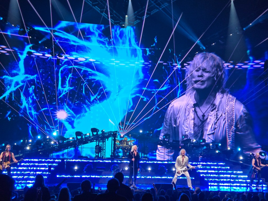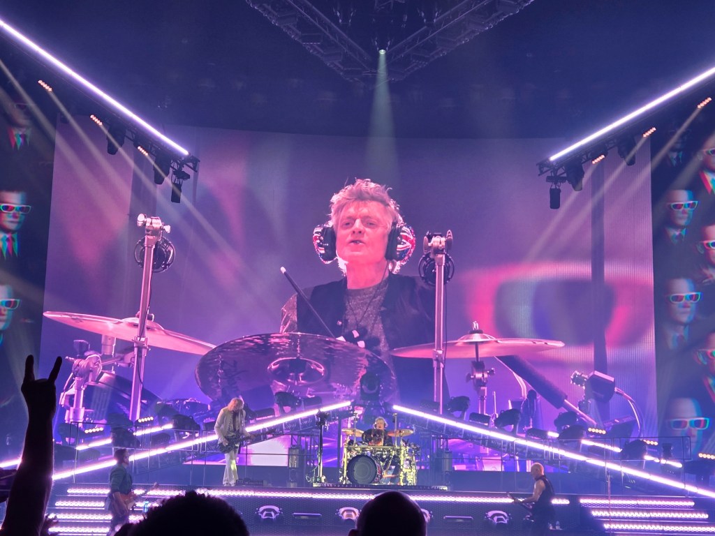 On Saturday, February 28, my dad and I found our seats at around 7:30 p.m. and the show started at 8:14 p.m. We were seated in section 203, which was not bad, but I couldn’t take many close-up shots of the band without them being blurry. As a result, I didn’t take a lot of photos that night, except I got carried away during “Photograph” because I was trying to get a photo of Clark on the screens. A nice lady in a leopard print vest, who was sitting in the same row as us, complimented me on my fabulous Def Leppard pajama pants, which brightened my mood indeed! She also said the show was a bucket list concert for her and I found it really cool I was there when she experienced her first Def Leppard concert, knowing it was my third time seeing them live. I got to be part of her special moment, which was absolutely incredible!