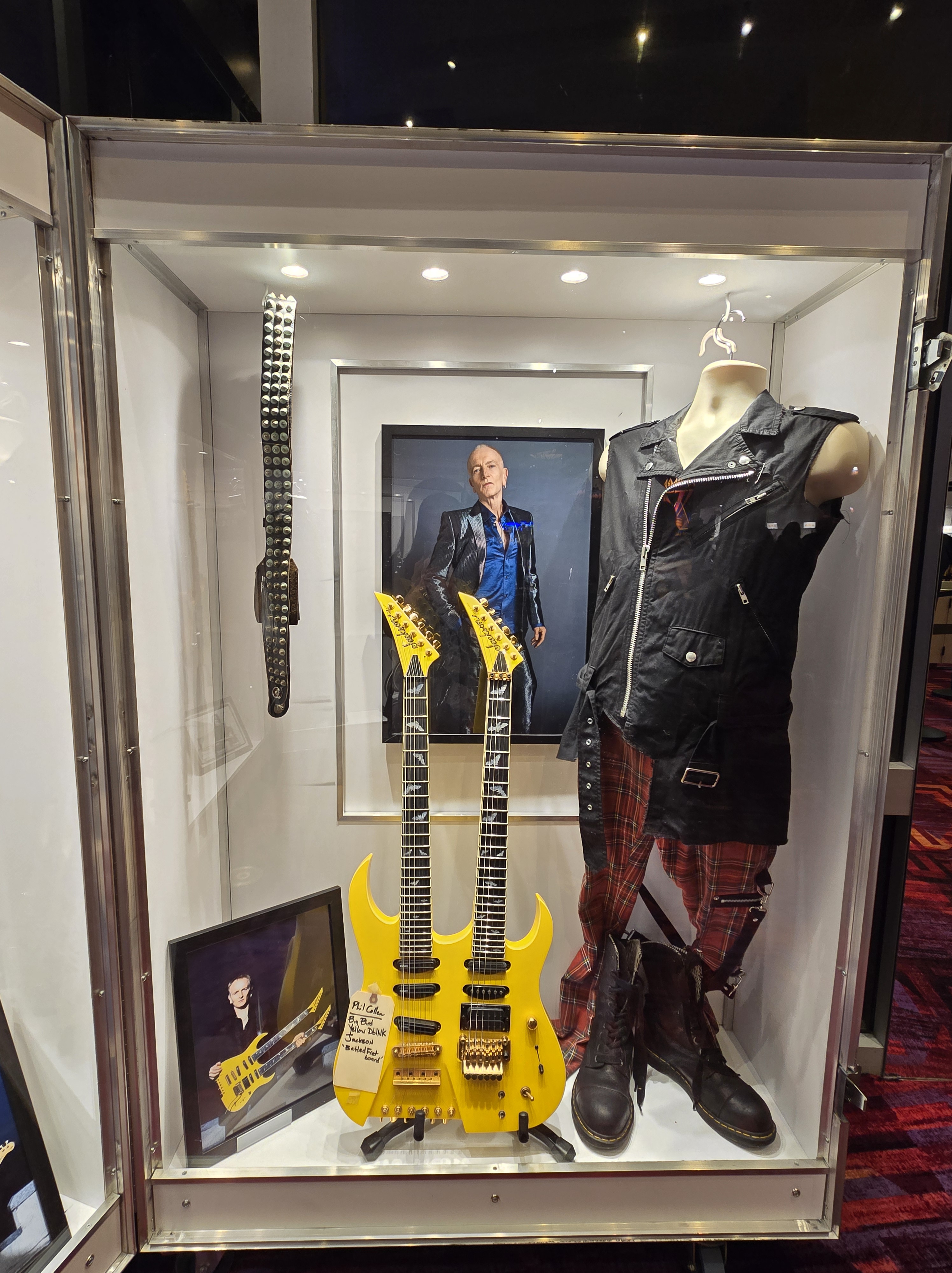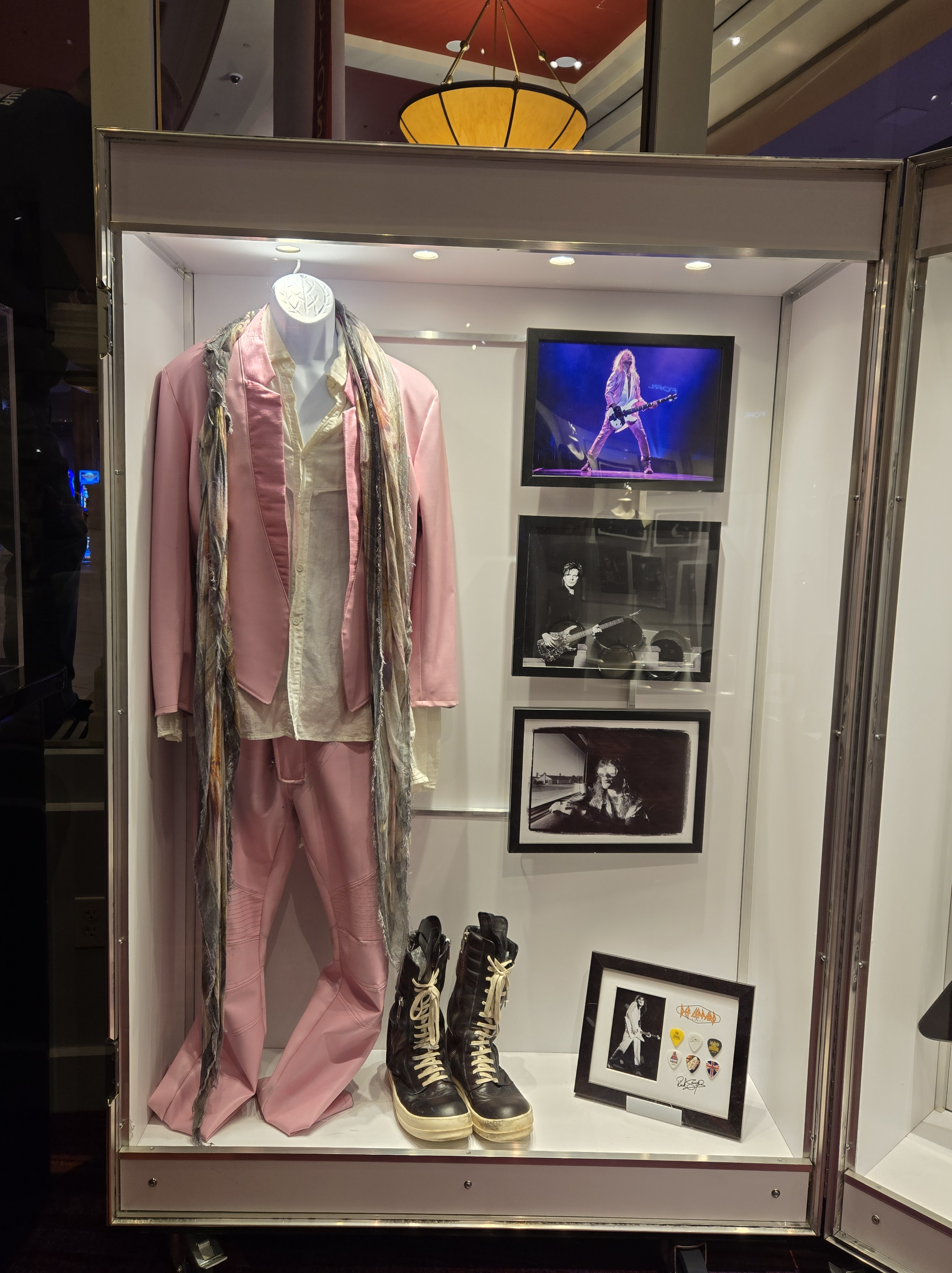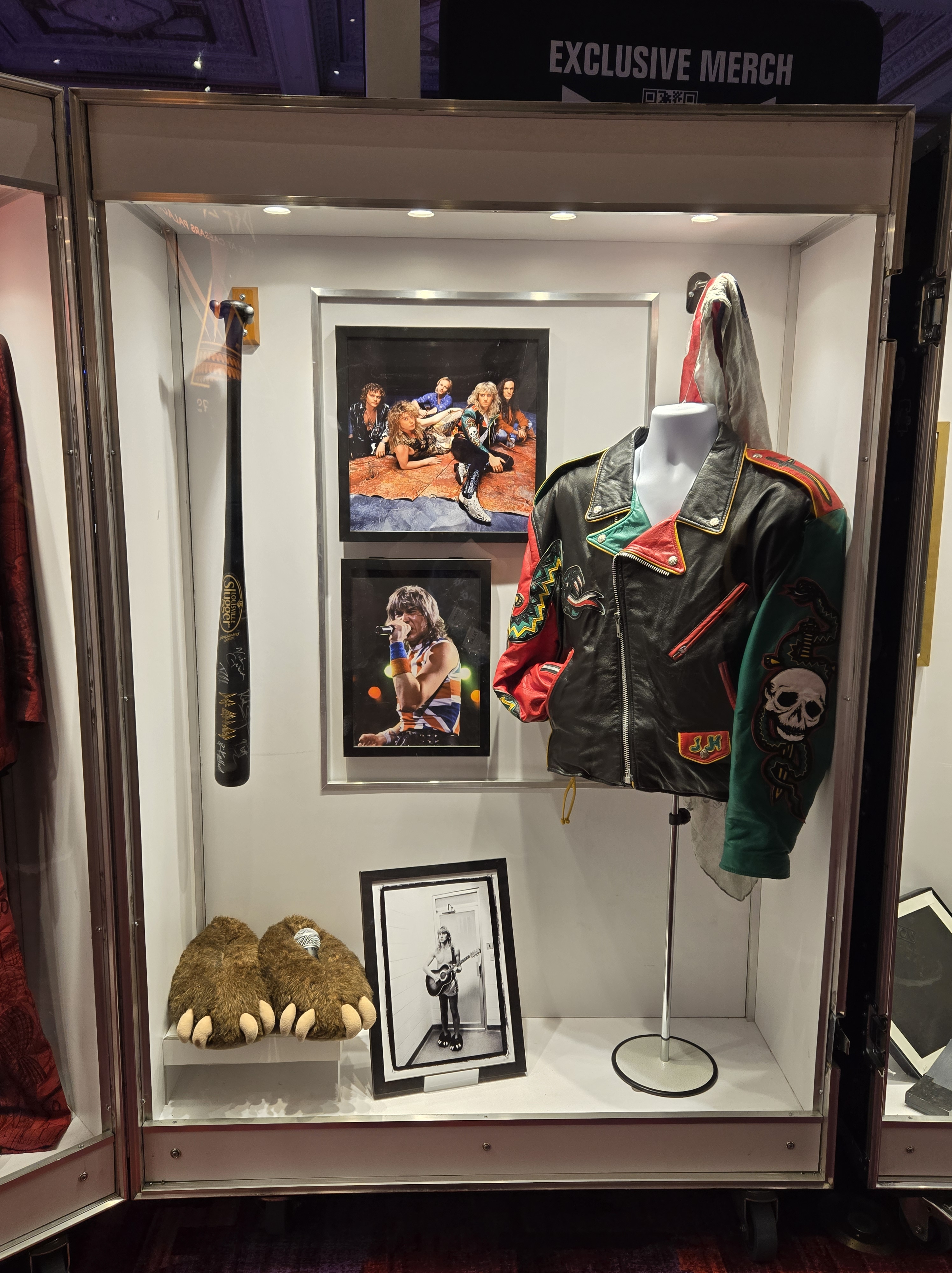 In the merch store, there were museum-like displays for each band member with photos, instruments, and old outfits. Heck, Elliott’s display included the bear slippers he used on the Hysteria tour. My mom missed Collen and Campbell’s displays when she attended the February 26 show, so I practically forced her to come to Caesars Palace on the February 28 show to see all of the Def Leppard history goodness awaiting her! Don’t worry, she enjoyed every minute of it, sort of. While the visuals were stunning and very colorful to look at, especially the neon animal print screens for “Rock of Ages,” the setlist was goddamn boring and lazy as heck!