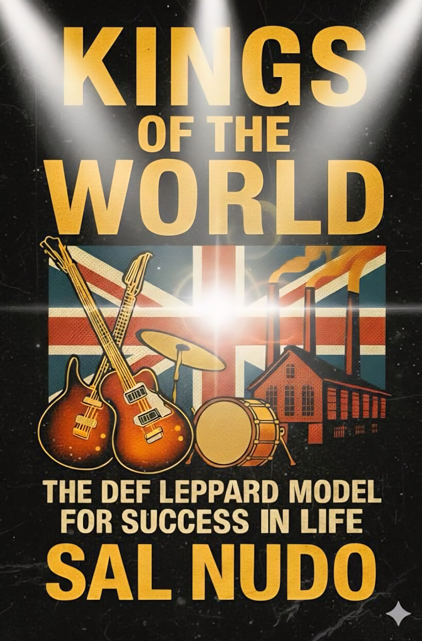 Two weeks ago, I was contacted by an author and Def Leppard enthusiast named Sal Nudo, who asked me if I could review his latest book, Kings of the World: The Def Leppard Model for Success in Life (2026). Of course, I said yes because not only are Def Leppard my favorite band ever, but also, I thought it was a fascinating concept to examine how they became one of the biggest bands in the world and how their methodology can lead people towards their own success stories. The book title was inspired by a Def Leppard song called, “Kings of the World,” from Mirror Ball – Live & More (2011). Kings of the World is partially a self-help book and partially a case study of Def Leppard. The reason Nudo chose Def Leppard is because they’ve been through tremendous ups and downs throughout their career. Thanks to their Sheffield working-class roots and supportive parents, the band were instilled with intense drive and focus from the get-go, allowing them to push through any obstacles that stood in their way. Notable examples that have been well documented include drummer Rick Allen’s tragic car accident on New Year’s Eve 1984 and the passing of late guitarist Steve Clark in January 1991. Also, don’t forget about guitarist Vivian Campbell being diagnosed with Hodgkin’s lymphoma in 2013.